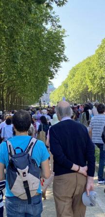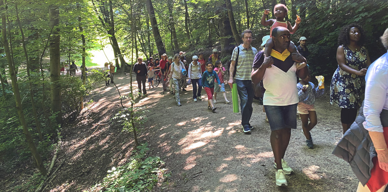 La petite troupe, témoin de la diversité de notre Eglise, comportait deux prêtres, plusieurs religieuses et des laïcs, engagés ou pas et de tous les âges. Depuis les séniors jusqu’aux mamans avec des poussettes, chacun a pu apprécier dès la première montée combien nous nous sentions portés par l’Esprit Saint. Les échanges ont été riches, nous avons pu faire connaissance, aidés par quelques questions de type « continuez la route avec des personnes nées le même mois que vous ». Nous avons ainsi cheminé à travers les rues d’Uccle puis le bois de la Cambre jusqu’à l’avenue Louise où nous avons terminé le trajet en tram et métro jusqu’au parc Elisabeth.