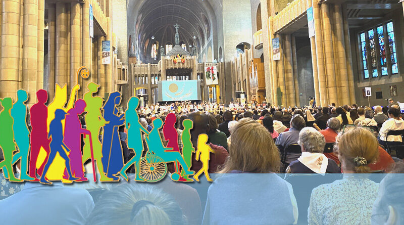 Là, une surprise de taille nous attendait puisque toutes les routes se sont retrouvées pour former une magnifique illustration du Peuple de Dieu en marche, plusieurs centaines de personnes se dirigeant dans la bonne humeur et les chants joyeux vers la Basilique où nous attendaient notre Cardinal et notre Evêque auxiliaire. Nous avions l’impression d’être dans les pas de Jésus lors de son entrée triomphale à Jérusalem !
