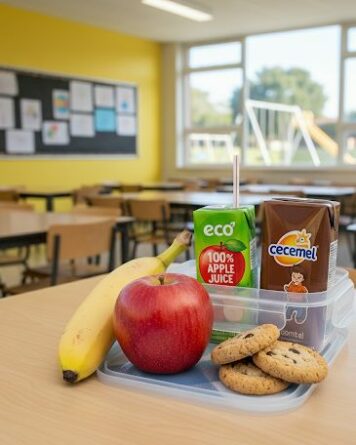 Berlingots de jus, lait chocolaté, lait fruité, barres céréales, petites boîtes de céréales, biscuits, galettes,…