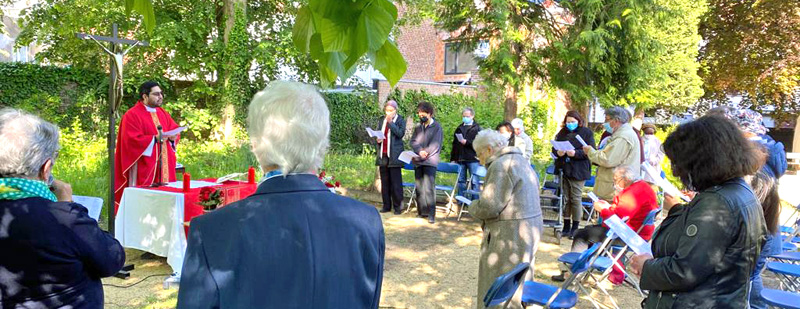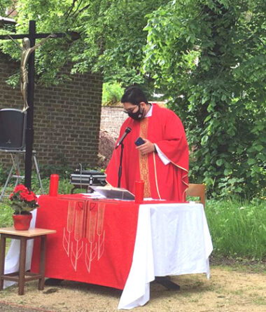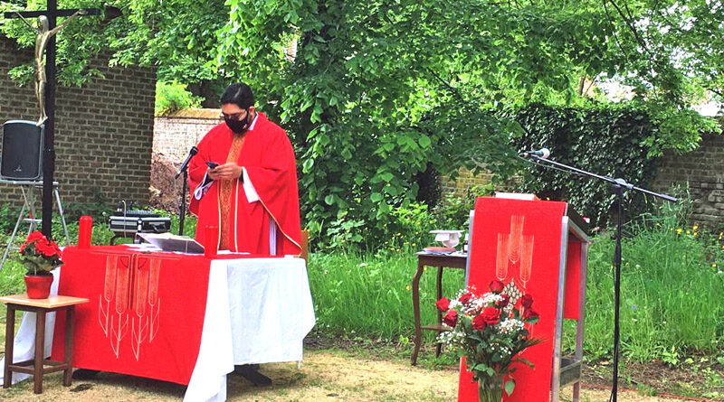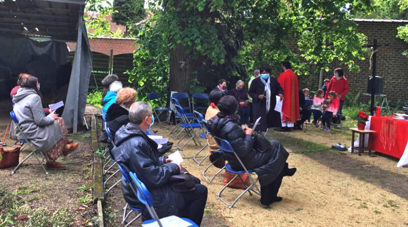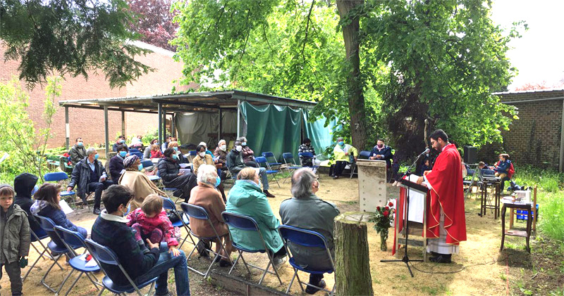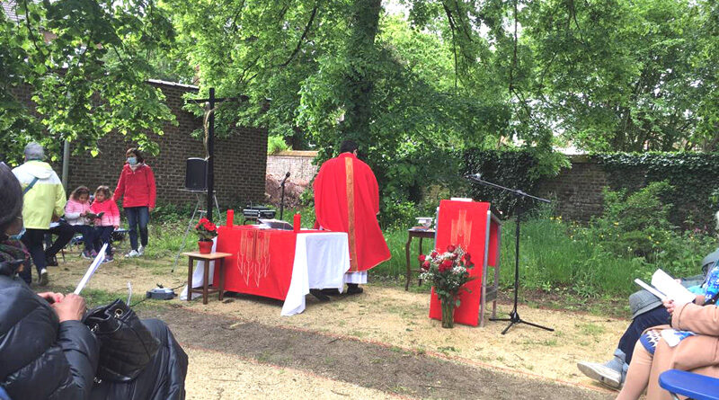 Quelle belle initiative que ces deux messes à 50 personnes en extérieur pour la Pentecôte ! Pour ma part, j’ai trouvé cela très agréable. Se retrouver à plus de 15 personnes (enfin !), être au grand air et profiter du souffle du vent pour la fête de l’Esprit Saint, que demander de plus ? Tout était en place : l’autel, l’ambon, les chaises, les micros, la musique, une très belle célébration. L’Abbé Alejandro craignait la pluie mais la providence veillait, nous avons pu participer à la messe dans la joie et sans encombre, que ce soit à 9h30 ou 11h.